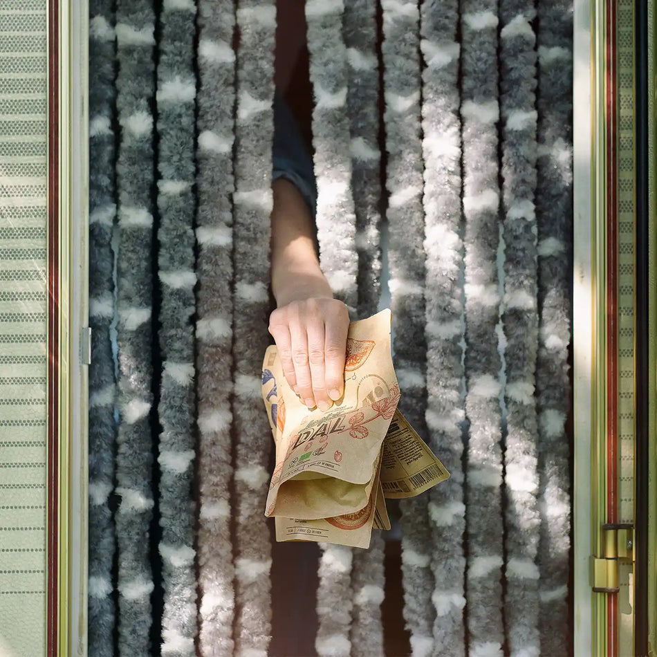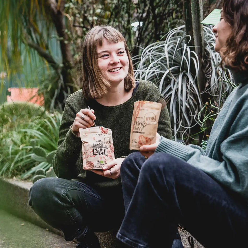 We decided to immerse it in a thick tomato-coconut sauce with fragrant herbs: coriander and curry leaves, cumin, and turmeric. Rounded with a clove of garlic and a dash of jaggery, unrefined sugar made from sugar cane juice using traditional methods. The result? An exquisite freeze-dried vegan version of the Indian classic.
